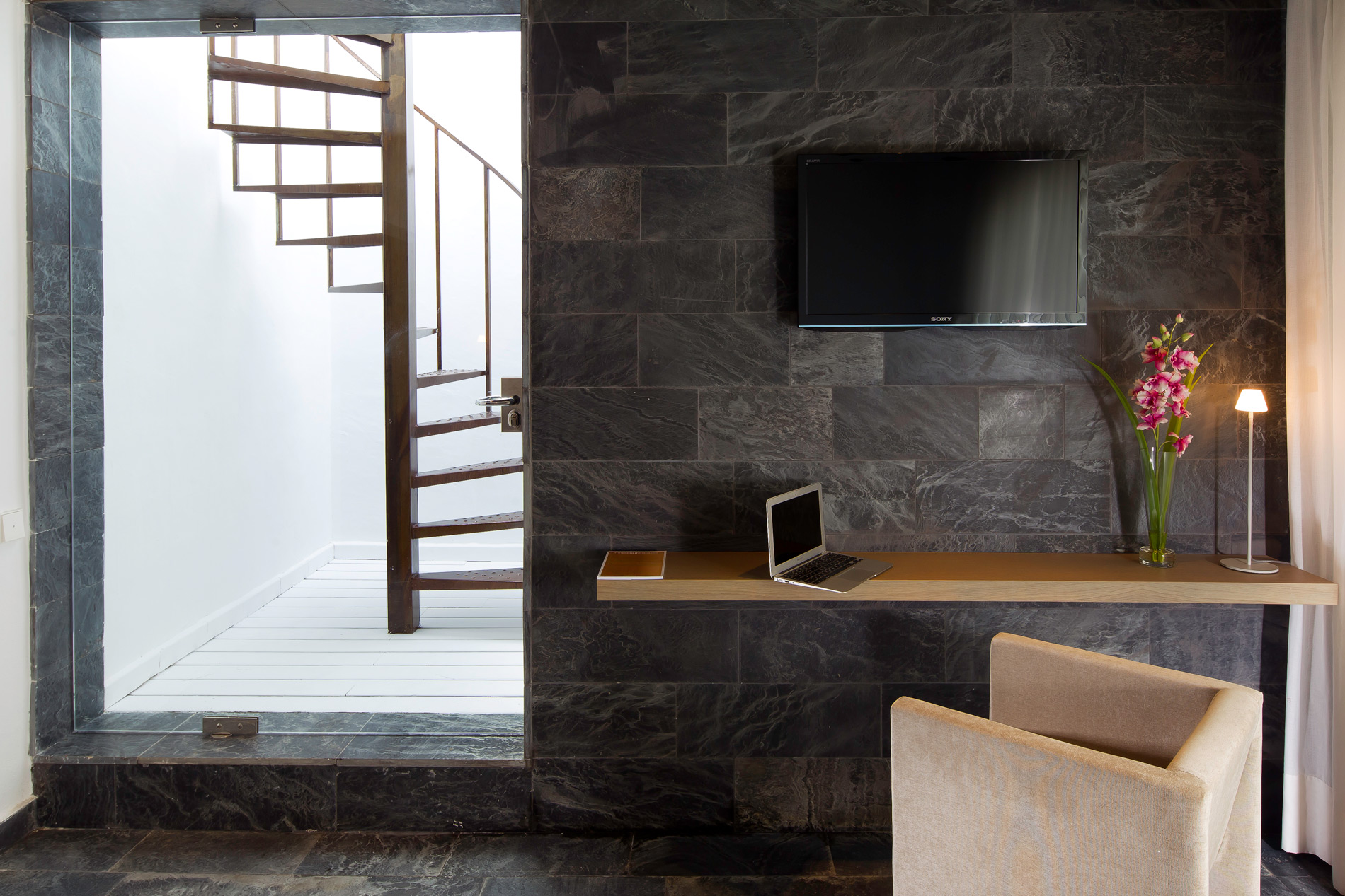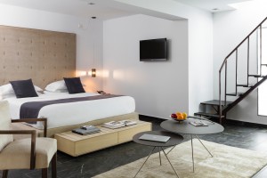 Sur deux niveaux la chambre occupe le dernier étage et offre une excellente vue sur la baie, chambre avec salon, composée d’éléments soignés d’architecture intérieure et terrasse avec grande baignoire d’hydromassage de design.
